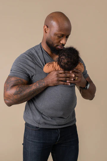Le premier t-shirt de portage conçu exclusivement pour les papas, qui permet de passer au portage facilement. Pas de nouages compliqués ni de boucles : il suffit de glisser votre bébé dans la poche avant et de profiter d’un maintien confortable et les mains libres.