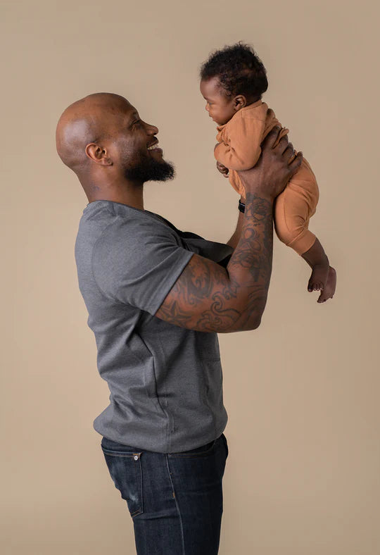 Le Dad Shirt est fabriqué dans un mélange polyester/spandex sur mesure, conçu spécialement pour le port de bébé — assez résistant pour supporter en toute sécurité un bébé jusqu’à 7 kg.